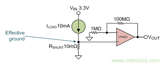 電源電壓為3.3V。在正確操作的情況下,系統(tǒng)得出最大電流值為10mA;你不想要有效接地,使負(fù)載高于100µV。你首先要明白一點(diǎn),分流電阻的壓降(由于電流)必須小于或等于100µV。