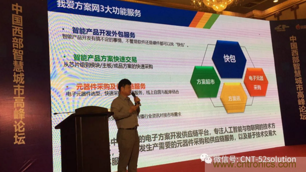 【導(dǎo)讀】為服務(wù)西部產(chǎn)業(yè)創(chuàng)新,中電網(wǎng)絡(luò)技術(shù)/我愛方案網(wǎng)攜手四川本地技術(shù)服務(wù)商與中國電子信息博覽會(huì)來到成都,我愛方案網(wǎng)的CEO劉杰博士在2018中國智慧城市高峰論壇做大會(huì)報(bào)告,圍繞“AI支撐智慧城市和IoT技術(shù)方案發(fā)展”做了主題講演。