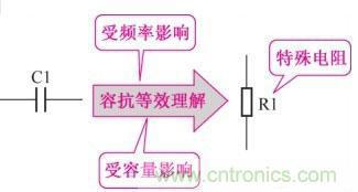 根據(jù)上述內(nèi)容可以將電容等效成一個“電阻”(當然是一個受頻率高低、容量大小影響的特殊電阻),如圖1-30所示,這時可以用分析電阻電路的一套方法來理解電容電路的工作原理,這是電路分析中常用的等效理解方法。等效理解的目的是為了方便電路分析和對工作原理的理解。