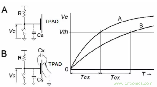 11、電容觸摸屏原理:通過充放電的曲線不同來檢測(cè)是否被按下。 實(shí)際的實(shí)驗(yàn)過程中,TPAD可以用一塊覆銅區(qū)域來替代,通過電容的充放電常數(shù)來確定是否按下。