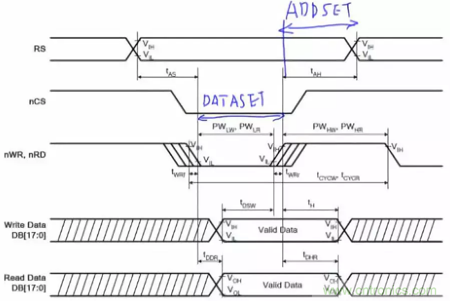 而ADDSET指的是地址建立時(shí)間,指的是片選之后到讀/寫操作之前的時(shí)間,這是針對(duì)SRAM來說的,如果操縱的是TFT,不存在地址線,所以此時(shí)的ADDSET就是讀/寫信號(hào)結(jié)束到RS電平的轉(zhuǎn)換時(shí)間。
