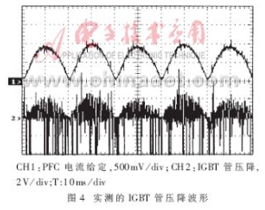圖5所示為IGBT過(guò)流時(shí)實(shí)際檢測(cè)到的PFC電感中流過(guò)的電流及保護(hù)電路動(dòng)作的波形。
