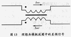 差模電流以相反的方向流過共模扼流圈的繞阻,建立大小相等,極性相反的磁場(chǎng),它能使輸出相互抵消,見圖13。這就使共模扼流圈對(duì)差模信號(hào)的阻抗為零。差模信號(hào)能不受阻地通過共模扼流圈。