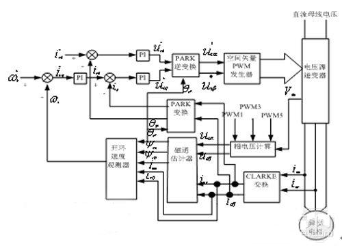 無速度傳感器的矢量控制就是通過檢測異步電機的相電流和相電壓,采用一定的觀測技術(shù)觀測出異步電機的轉(zhuǎn)速,作為矢量控制系統(tǒng)中轉(zhuǎn)速閉環(huán)的轉(zhuǎn)速反饋。如圖3所示。