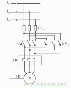 在眾多的操作系統(tǒng)中均要求電動機能夠?qū)崿F(xiàn)正反轉(zhuǎn)給操作,從電動機的工做原理中可知,需將三相電源中的任意兩個進(jìn)行對調(diào),就能實現(xiàn)電動機的反向運轉(zhuǎn),因此電動機實現(xiàn)正反轉(zhuǎn)的實質(zhì)便是電源進(jìn)線的調(diào)換。但若僅調(diào)換進(jìn)線,容易導(dǎo)致電源短路,因此必須設(shè)置互鎖,圖2是三相異步電動機正反轉(zhuǎn)的原理設(shè)計圖,圖中KM1和KM2均是交流接觸器主觸頭,當(dāng)KM1吸合時,KM2交流接觸器主觸頭就會斷開,然后便可實現(xiàn)電機的正轉(zhuǎn)。若是斷開交流接觸器主觸頭KM1,KM2就會吸合,此時電動機則會實現(xiàn)反轉(zhuǎn),圖中的FU1主要用于防止電源短路,圓形代表電機M。