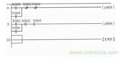 在圖3梯形圖中,PLC外部按鈕所控制的常開觸點主要是左母線的第一等級以及第二等級的X001觸點和X002觸點,只需按鈕便可使得X000或X001任意一個常開觸點閉合,輸出繼電器Y005或繼電器Y004就能通過相應(yīng)線路形成閉合回路,進(jìn)而使常開接觸點Y005或Y004實現(xiàn)自鎖功能同時實現(xiàn)電動機的正反轉(zhuǎn)。停止通過PLC外部的按鈕實現(xiàn),按鈕通過釋放X002常開接觸點,使得繼電器斷電引發(fā)電動機停止運轉(zhuǎn)。