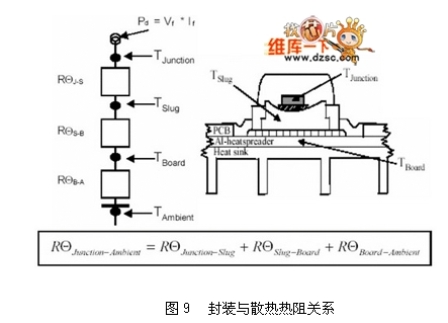 散熱設(shè)計是LED光源區(qū)別于傳統(tǒng)光源的課題之一。傳統(tǒng)燈具產(chǎn)生的熱遠高于LED,但傳統(tǒng)燈具不會因為高溫而降低其光源輸出能力,但LED的光輸出卻會隨著本身接口(Junction, PN接口)溫度的升高而下降,如圖8所示。而其產(chǎn)生的熱如何散除到外界環(huán)境與其封裝結(jié)構(gòu)材料息息相關(guān),牽涉到使用的散熱材料與相關(guān)外型,關(guān)系如圖9所示,其中熱阻的概念,代表輸入W功率時,需要提高多少K溫度才足以散熱。以現(xiàn)有的封裝技術(shù)最高可允許LED操作在185℃(Lumiled?。耍玻?,但一般因為封裝膠材的關(guān)系,可允許的操作溫度約在125℃,除了考慮光源輸出效率之外,亦考慮封裝膠材的變質(zhì)(樹脂類材料在高溫有老化現(xiàn)象)。