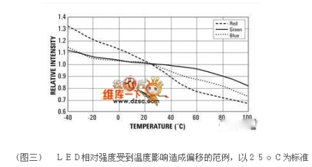這類LED光源的簡(jiǎn)單開(kāi)迴路架構(gòu)方式有個(gè)潛在的問(wèn)題,由于LED的光學(xué)特性會(huì)受到運(yùn)作條件的影響,因此組合后的RGB光源輸出的亮度以及色度都會(huì)變化。同時(shí),每顆LED元件也不盡相同,因此造成RGB光源的輸出產(chǎn)生更多變化,(圖二)與(圖三)就描述了幾個(gè)LED變動(dòng)的范例。