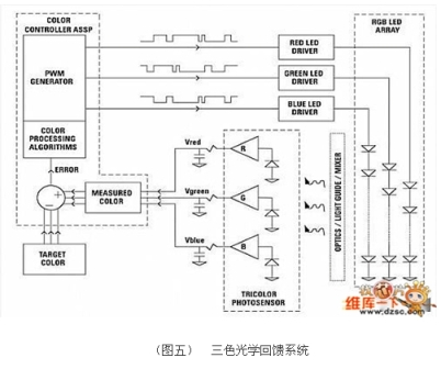 另一個(gè)更先進(jìn)的光學(xué)反饋方式則是采用三色光感測(cè)器,通常包含三個(gè)獨(dú)立的光感測(cè)器以及上方的三色濾鏡,讓這類光感測(cè)器能夠記錄色彩資訊而不只是亮度,這將可以進(jìn)一步控制紅、綠與藍(lán)光LED的發(fā)光強(qiáng)度比,這個(gè)功能相當(dāng)關(guān)鍵,因?yàn)樗專遥牵鹿庠吹牧炼扰c色度得以控制,而ASSP則在三色光學(xué)反饋設(shè)計(jì)上扮演了重要的角色。