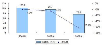 圖1 2006-2008年中國(guó)DVD播放機(jī)銷售額規(guī)模與增長(zhǎng)