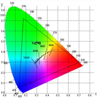 定義您的色域并不簡單。大多數(shù)LED制造商的規(guī)格數(shù)據(jù)中并沒有提供其LED的色度坐標(biāo)。不過,當(dāng)您有了色度坐標(biāo)后,就可輕易標(biāo)出LED在色彩空間中的位置,如圖2所示。圖中系統(tǒng)色域的三角形覆蓋在CIE 1931色彩空間的上面。CIE 1931 色彩空間代表人眼能看到的所有顏色;在色彩曲線外的是波長,此數(shù)據(jù)描繪了色度坐標(biāo)。在這個圖中,加入了普朗克軌跡(Planckian locus),或為一個黑體加上顏色,代表黑體在溫度變化時在色彩空間的坐標(biāo)。以普通詞匯來說,這坐標(biāo)代表不同種類的白光通過CCT之后的結(jié)果。