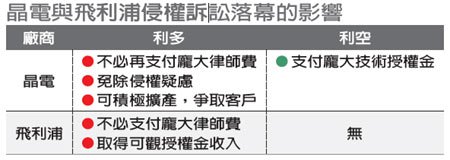 在雙方達成和解后,晶電同時取得飛利浦的AlInGaP發(fā)光二極管的技術(shù)授權(quán),授權(quán)條件則不予揭露。至于晶電與日廠日亞化(NICHIA)有關(guān)藍光LED的兩起侵權(quán)官司,則早已和解、撤銷,隨與飛利浦間的侵權(quán)訴訟落幕,晶電目前再無侵權(quán)訴訟案纏身。