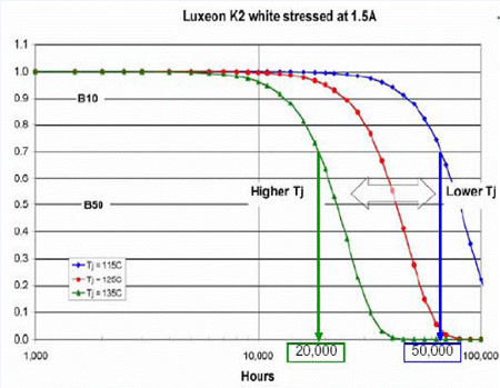 當結溫從115℃提高到135℃,就會使壽命從50,000小時降低到20,000小時。其他各家公司的光衰曲線應當可以向原廠索取。