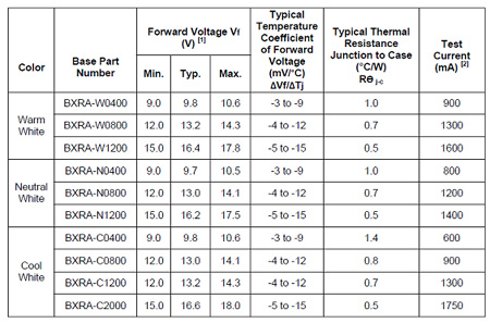 假定對LED以Io恒流供電,在結溫為T1時,電壓為V1,而當結溫升高為T2時,整個伏安特性左移,電流Io不變,電壓變?yōu)閂2。這兩個電壓差被溫度去除,就可以得到其溫度系數(shù),以mV/oC表示。對于普通硅二極管,這個溫度系數(shù)大約為-2mV/oC。但是LED大多數(shù)不是用硅材料制成的,所以它的溫度系數(shù)也要另外去測定。幸好各家LED廠家的數(shù)據(jù)表中大多給出了它的溫度系數(shù)。例如對于Cree公司的XLamp7090XR-E大功率LED,其溫度系數(shù)為-4mV/oC。要比普通硅二極管大2倍。至于美國普瑞的陣列LED(BXRA)就給出了更為詳細的數(shù)據(jù)。