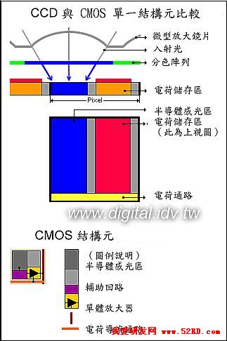 CCD與CMOS電路結(jié)構(gòu)之完整比較(摘錄自SHARP月刊)差異分析整體來(lái)說(shuō),CCD與CMOS兩種設(shè)計(jì)的應(yīng)用,反應(yīng)在成像效果上,形成包括ISO感光度、制造成本、解析度、雜訊與耗電量等,不同類型的差異:ISO感光度差異:由于CMOS每個(gè)畫素包含了放大器與A/D轉(zhuǎn)換電路,過(guò)多的額外設(shè)備壓縮單一畫素的感光區(qū)域的表面積,因此在相同畫素下,同樣大小之感光器尺寸,CMOS的感光度會(huì)低于CCD?!?br />