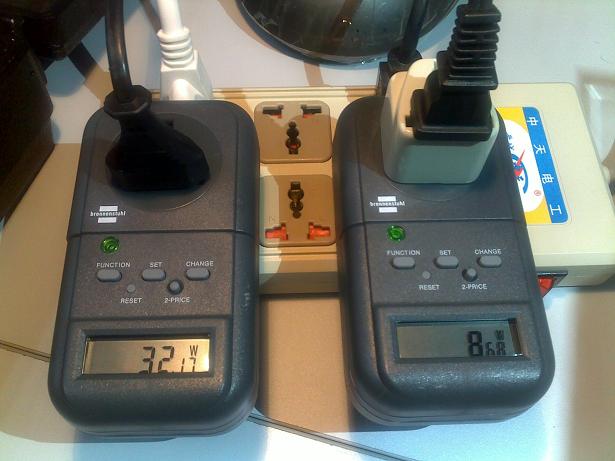 圖4.左邊為鹵素臺(tái)燈的能耗為32.17W,右邊為L(zhǎng)ED燈的能耗為8.68W