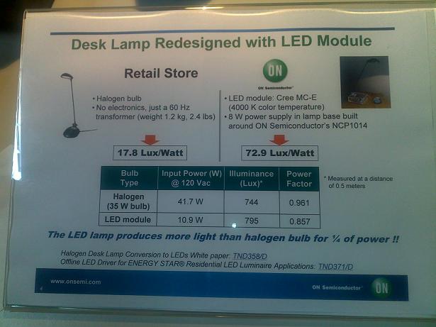 現(xiàn)場(chǎng),Laurent為我們演示了用LED模塊代替鹵素臺(tái)燈在能效方面的差異,如下圖所示:可以看出,使用LED燈作臺(tái)燈的能耗僅相當(dāng)于鹵素?zé)舻?/4。