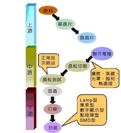 (二)中游:主要產(chǎn)品為晶粒。依LED不同需求進(jìn)行磊芯片擴(kuò)散、金屬蒸鍍、再在磊芯片上光罩、蝕刻、熱處理,制成晶粒電極,最后經(jīng)過(guò)晶粒切割、測(cè)試、檢驗(yàn)后完成。