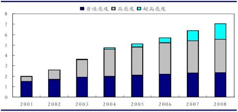 2008年全球LED市場(chǎng)規(guī)模約為69億美元,其中高亮度和超高亮度LED 市場(chǎng)年平均增長(zhǎng)率將達(dá)到20%左右,市場(chǎng)規(guī)模達(dá)16億美元。在移動(dòng)手機(jī)應(yīng)用市場(chǎng)的快速推動(dòng)下,過(guò)去10年高亮度LED市場(chǎng)的年均增長(zhǎng)率達(dá)到46%。