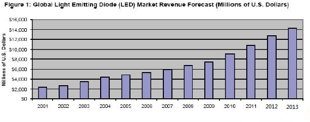 到2013 年,全球LED 市場(chǎng)將達(dá)到143 億美元,比2009 年增長(zhǎng)近一倍。