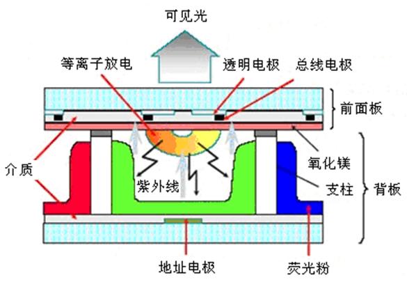 PDP是Plasma Display Panel的簡(jiǎn)寫(xiě),也就是等離子體顯示器。PDP顯示器的工作原理是,通過(guò)加電,讓等離子汽體(一般為惰性氣體)在強(qiáng)電場(chǎng)中放電產(chǎn)生紫外線,然后通過(guò)紫外線激發(fā)熒光粉發(fā)光,PDP顯示器的工作原理如圖5所示,其結(jié)構(gòu)如圖6所示。