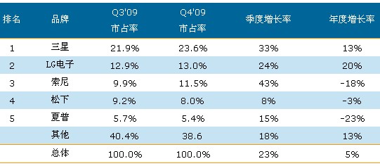 LG為2009年第四季的全球電視市場銷售金額的第二名,而在前五名之中LG是增長最快的。LG的2009年全年銷售金額占有率達(dá)到了13.2%,較2008年整整增長了2個百分點。