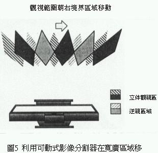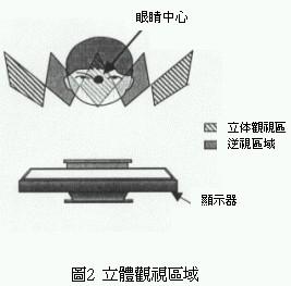利用這種原理可以針對(duì)觀視者觀賞畫面時(shí)的最適當(dāng)位置,除了提供觀視者左右兩眼影像之外,由影像正面的顯示區(qū)到最適距離所函蓋的區(qū)域,對(duì)觀視者而言就變成正常的立體三次元影像。不過兩眼視線相鄰處的影像,會(huì)被左、右兩眼在無意識(shí)狀態(tài)下捕捉讀取形成所謂的逆視領(lǐng)域,換句話說使用這種三維立體影像分割器的觀視者必需固定在一定的觀視位置才能產(chǎn)生立體視覺效果(圖2)。