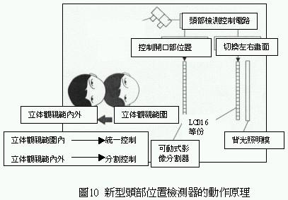 為了改善上述缺失因此開發(fā)出頭部檢測(cè)系統(tǒng)(headtrackingsystem),利用這種檢測(cè)系統(tǒng)可隨時(shí)偵測(cè)觀視者頭部位置,一旦產(chǎn)生逆視領(lǐng)域時(shí)顯示器會(huì)立即切換左右兩眼所讀取的影像,如此一來不但可以防止逆視問題的發(fā)生,還可以擴(kuò)大三次元立體影像的可觀視范圍.