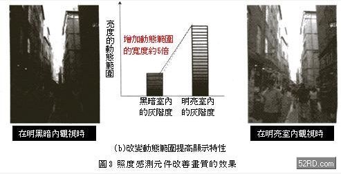 有關(guān)液晶電視的應(yīng)用,主要是液晶顯示器的點燈時間越久消費電力就越大,相對的散熱處理與散熱風扇的噪音則變成非常棘手的問題,尤其是目前大型液晶電視的輝度大多超過時,在明亮室內(nèi)畫面非常的亮麗,不過在黑暗室內(nèi)卻會出現(xiàn)波紋現(xiàn)象,而且畫面太亮容易造成眼睛疲勞,黑暗色影像的黑色浮動現(xiàn)象非常明顯,影像對比則大幅降低。由于一般液晶電視是根據(jù)各畫素的液晶穿透率,調(diào)整背光模組的光線達成灰階化顯示目的,然而過多的背光模組光量卻有漏光之虞,如果利用照度感測元件偵測液晶電視視聽環(huán)境的亮度,依此調(diào)整背光模組的輝度,除了影像黑色浮動之外,灰階數(shù)相同的條件下還可以縮小亮度的動態(tài)范圍(dynamicrange),進而提高黑色影像表現(xiàn)能力(圖3(b)),并降低最大輝度解除影像太亮的困擾,這意味著觀賞液晶電視時,消費者不會受到視聽環(huán)境的影響,隨時可以獲得細膩的影像。