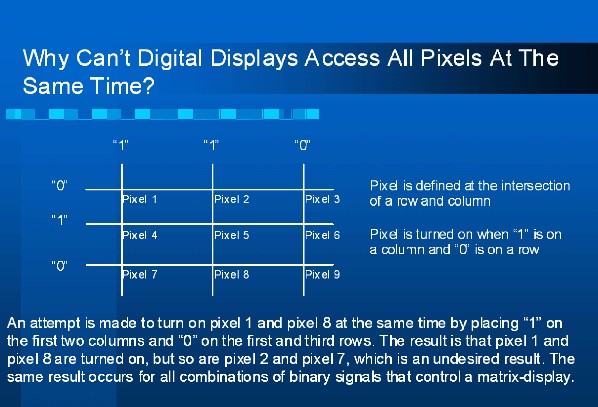 由于存在上述數位控制的問題,畫素級的多線定址方法一直是類比式的。影像數據在處理器中仍以數位方式處理,但採用影像分解方法將影像分解成行列數據,然后再以數位類比轉換器(DAC)轉換成類比訊號。類比的行與列訊號通常是OFDM載波,而行與列訊號中的每個頻率元件代表顯示器中單一畫素的控制。