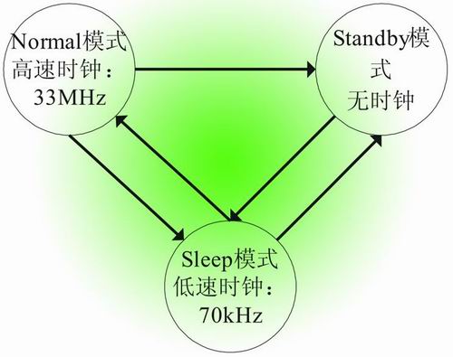 電子紙顯示的顯著特點之一是其省電模式,當其顯示一幅畫面后,由于電子紙的特殊技術(shù)因素,此幅畫面在無供電或不刷新的情況下可長時間保持。APOLLO芯片驅(qū)動部分也同樣具有兩種省電模式:Sleep和Standby,能夠很好的實現(xiàn)低功耗的工作方式。Sleep模式使用低時鐘(70kHz),能夠接收主CPU的指令;Standby模式不使用時鐘,利用主CPU的喚醒信號使APOLLO恢復(fù)有效。這兩種模式與Normal模式的轉(zhuǎn)換如圖5所示。