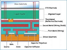 那么它是怎樣工作的?液晶可以使光線的偏振性發(fā)生偏轉(zhuǎn),而偏轉(zhuǎn)量可通過電場進(jìn)行控制。鏡片后面的硅片產(chǎn)生控制每個像素的電場,實(shí)際上鏡片就是硅片最上一層,液晶直接裝在鏡片上面,這也是它叫做“硅基液晶”的原因。大多數(shù)芯片的尺寸為四分之三英寸,圖2a顯示了一個LCoS芯片的照片。生成圖像時(shí),偏振光聚焦在芯片上,通過變換每個像素后面電場來控制其亮度。電場使光線發(fā)生偏轉(zhuǎn),然后用一個偏振過濾器把偏轉(zhuǎn)部分擋住。硅片產(chǎn)生電場實(shí)際上就像計(jì)算機(jī)內(nèi)存芯片一樣工作,按照像素的行列進(jìn)行組織,每個像素都有一個地址,就像內(nèi)存位置一樣,圖2b顯示了一個LCoS的截面圖。