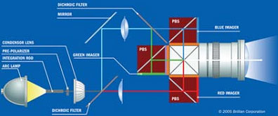 LCoS的基本原理是在液晶層后面用一個鏡子,光線從前面進(jìn)來后穿過液晶層,經(jīng)過鏡子反射再次穿過液晶層射到屏幕上。這需要稍微復(fù)雜一些的光學(xué)部件,但確實(shí)非常有用,它有幾個直接明顯的優(yōu)點(diǎn),如所有電子部件都在鏡子后面,完全在光路以外。在它后面有很大空間,這樣就可能達(dá)到難以置信的高分辨率,LCoS在所有顯示技術(shù)中分辨率最高。另外因光線兩次穿過液晶,可以達(dá)到很高對比度但依然非常薄,從而大大改善響應(yīng)時(shí)間減少拖影。我們將在第三部分討論LCoS的優(yōu)點(diǎn)和缺點(diǎn)。