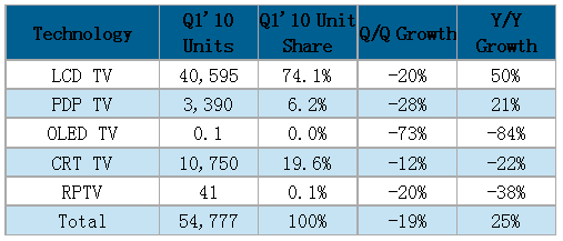 - 2010年第一季所有種類電視機出貨量較去年同期成長55%
