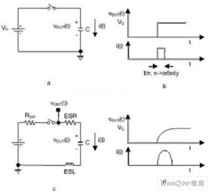 圖1︰從一個電壓源對電容進(jìn)行充電(圖a和b是理想情況,c和d是實(shí)際情況)。