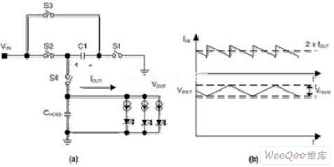 白光LED通常由一個恒定直流電流源驅(qū)動,以保持恒定的亮度。在采用單顆鋰離子電池供電的便攜式應(yīng)用中,白光LED以及電流源上的電壓降之總和可以比電池電壓更高或更低,這意味著白光LED某些時候需要對電池電壓進(jìn)行升壓。完成這樣應(yīng)用的最好辦法是使用升壓DC-DC轉(zhuǎn)換器。這種方法可以大大地優(yōu)化效率,但代價是成本和PCB面積增加。另外一種提升電池電壓的方法是使用電荷泵,也稱為開關(guān)電容轉(zhuǎn)換器。本文將詳細(xì)地分析這種器件的工作原理。