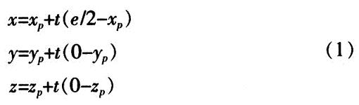 左視點(diǎn)Leye和右視點(diǎn)Reye均位于X軸上,兩視點(diǎn)間的距離為e,兩視點(diǎn)連線中心為坐標(biāo)原點(diǎn),則左視點(diǎn)的坐標(biāo)為(-e/2,0,0),右視點(diǎn)的坐標(biāo)為(+e/2,0,0)。投影平面平行于XY平面,到左右視點(diǎn)的距離均為d。三維空間中一點(diǎn)P(xp,yp,zp)在左視點(diǎn)投影中的坐標(biāo)為(xl,yl,zl),在右視點(diǎn)投影中的坐標(biāo)為(xr,yr,zr),則zl=zr=d。點(diǎn)P(xp,yp,zp)和Reye投影線的參數(shù)方程為: