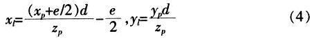 將式(2)帶入式(1)得點(diǎn)P在投影平面的坐標(biāo)(xr,yr):