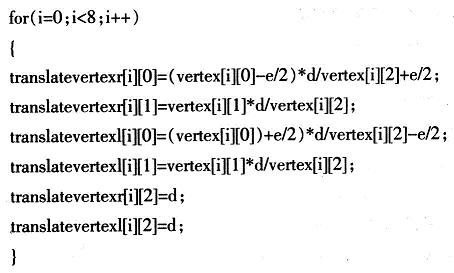 按上述投影算法計(jì)算出立體圖像對(duì)后,應(yīng)用OpenGL繪制立體圖像對(duì),分別用紅、綠兩種顏色繪制右眼和左眼的圖像。以一個(gè)變長為10cm,中心點(diǎn)在原點(diǎn)的正方體為例,設(shè)兩視點(diǎn)間距離e為5cm,投影面距高觀察者d為40cm,考察正方體的一個(gè)頂點(diǎn)(5,5,5),由上述投影算法可得:xr=32cm,xl=48cm,yl=yr=4040cm,zr=zl=d=40cm對(duì)8個(gè)頂點(diǎn)分別計(jì)算后,連接相應(yīng)的立體透視投影點(diǎn),即可得該立方體的立體圖像對(duì)。用數(shù)組vertex[8][3]存儲(chǔ)頂點(diǎn),數(shù)組translatevertexr[8][3]存儲(chǔ)右眼投影計(jì)算后坐標(biāo),數(shù)組translatevertexl[8][3]存儲(chǔ)左眼投影計(jì)算后的坐標(biāo),對(duì)相應(yīng)的點(diǎn)進(jìn)行投影計(jì)算: