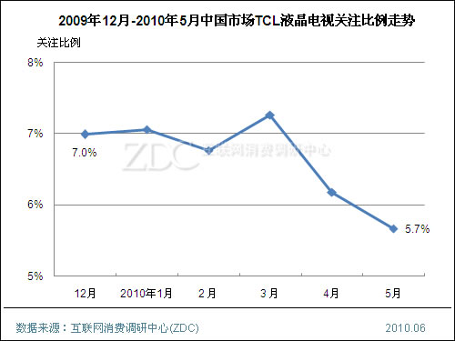 2009年,TCL在互聯(lián)網(wǎng)電視領(lǐng)域表現(xiàn)不俗,全年TCL液晶電視全球銷量為842萬臺,同比增長了101%。在2010年第一季度TCL的品牌關(guān)注比例走勢平穩(wěn),但4月開始其品牌關(guān)注比例有小幅下滑,5月已經(jīng)下滑至5.7%,排名下滑兩位。