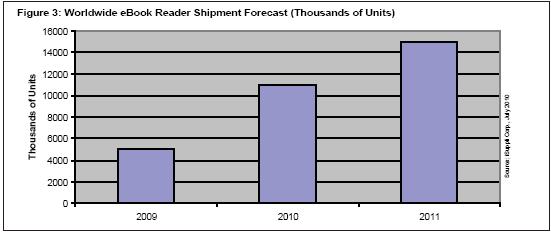 iSuppli公司預(yù)測,2010年全球是電子書閱讀器出貨量將增至1100萬個(gè),比2009年的500萬個(gè)增長120%,如圖3所示。目前,iSuppli公司無意大幅改變這個(gè)短期預(yù)測。