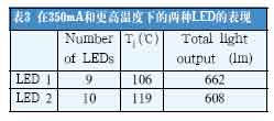 在數(shù)據(jù)表描述的25℃結(jié)溫和350mA的前向電流下,LED2的性能比LED1要好。但是,更實(shí)際的比較將在更高的結(jié)溫下進(jìn)行(見(jiàn)表3)。