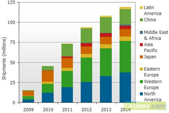 圖一:2009年~2014年聯(lián)網(wǎng)電視在不同區(qū)域的預估
