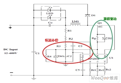 專利的源極驅(qū)動(dòng)電路由MOS管Q1、D6、Rg、Rt、Rcs與BP2808內(nèi)部電路組成,其顯著特點(diǎn)是有效降低功耗、提高恒流精度。源極驅(qū)動(dòng)方式的驅(qū)動(dòng)電路使系統(tǒng)消耗電流減少,尤其是減少了傳統(tǒng)的高壓差供電通路中類似R15-17上的電流,從而降低了功耗,提高了效率。D6、Rg可使開(kāi)關(guān)開(kāi)通驅(qū)動(dòng)變軟,關(guān)斷驅(qū)動(dòng)保持較強(qiáng),既改善EMI,又盡量不犧牲效率。與LED光源并聯(lián)的輸出濾波電容C0用以減少LED光源上的電流紋波。