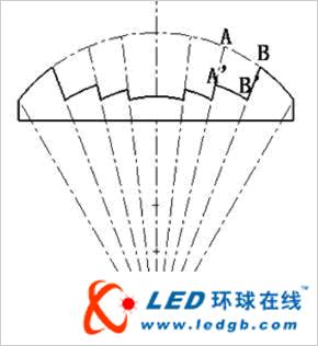 進一步分析知道,由于LED光源是在光軸部分的發(fā)光強度大,邊緣部分小,而分厚度法得到的鋸齒恰恰是在中間部分比在邊緣部分有更大的齒距(見圖3),因此在光強度大的地方損失會少,即總體上可以有更少的光損失。