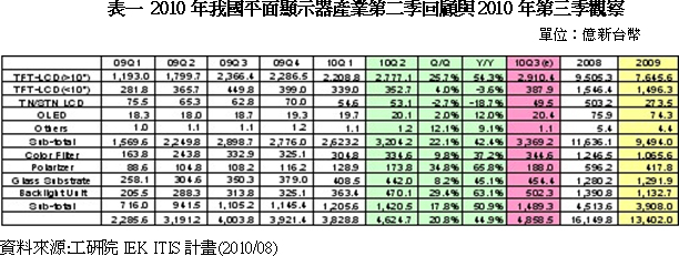 2010年第二季臺灣平面顯示器總產(chǎn)值達新臺幣4,624.7億元,比前一季成長20.8%。其中面板產(chǎn)業(yè)產(chǎn)值新臺幣3,204.2億元,比前一季成長22.1%,主力為大型TFT LCD面板產(chǎn)業(yè),產(chǎn)值約新臺幣2,777.1億元;其次為中小型TFT LCD面板產(chǎn)業(yè),產(chǎn)值約新臺幣352.7億元;TN/STN面板產(chǎn)業(yè),產(chǎn)值約新臺幣53.1億元,而OLED產(chǎn)業(yè)產(chǎn)值則為新臺幣20.1億元。關(guān)鍵零組件產(chǎn)業(yè)產(chǎn)約為新臺幣1,420.5億元,比前一季成長17.8%,其中彩色濾光片產(chǎn)業(yè)產(chǎn)值約新臺幣334.6億元,偏光板產(chǎn)業(yè)產(chǎn)值約新臺幣173.8億元,玻璃基板產(chǎn)業(yè)產(chǎn)值約新臺幣442億元,背光模組產(chǎn)業(yè)產(chǎn)值約新臺幣470.1億元。