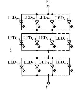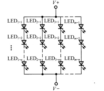 若干個(gè)LED先并后串的混聯(lián)形式如圖6所示。由于LED1-n~LEDm-n先并聯(lián)連接,提高了每組LED故障下的可靠性,但是由此一來(lái)每組并聯(lián)LED的均流問題就至關(guān)重要。為此,可以通過配對(duì)挑選,將工作電壓和電流盡量相同的LED作為并聯(lián)的一組,或者給每個(gè)LED串接小的均流電阻來(lái)解決。這種混聯(lián)形式具有的其他特點(diǎn)和存在的問題,與先串后并連接形式相類似。