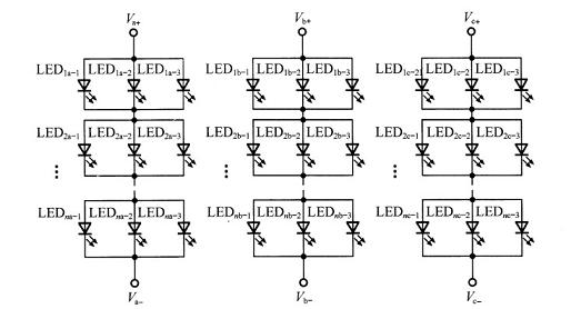 交叉陣列形式主要是為了提高LED工作的可靠性,降低故障率。主要構(gòu)成形式是:每串以3個(gè)LED為一組,分別接入驅(qū)動(dòng)器輸出的Va、Vb、Vc輸出端。當(dāng)一串中的3個(gè)LED都正常時(shí),3個(gè)LED同時(shí)發(fā)光;一旦其中一個(gè)或兩個(gè)LED失效開路時(shí),可以保證至少有一個(gè)LED正常工作。這樣一來(lái)就能夠大大地提高每組LED發(fā)光的可靠性,也就能夠提高整個(gè)LED發(fā)光的總體可靠性。