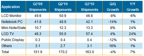 按應(yīng)用別來(lái)看,顯示器和筆記本電腦的出貨量較上一季下滑,但是第三季液晶電視和平板計(jì)算機(jī)的應(yīng)用持續(xù)成長(zhǎng)。筆記本電腦較前季下滑了14%,是有史以來(lái)最大單季下滑,而顯示器較前季下滑了8% 。這兩個(gè)應(yīng)用產(chǎn)品的面板價(jià)格從7月到10月間呈現(xiàn)顯著的下滑,估計(jì)要到11月才會(huì)開(kāi)始穩(wěn)定。9.7寸面板出貨量大幅上揚(yáng),使得迷你筆電和平板計(jì)算機(jī)的出貨量較前季成長(zhǎng)8 %,整體出貨量從2010年第二季的3百萬(wàn)片,成長(zhǎng)到第三季的5百60萬(wàn)片。