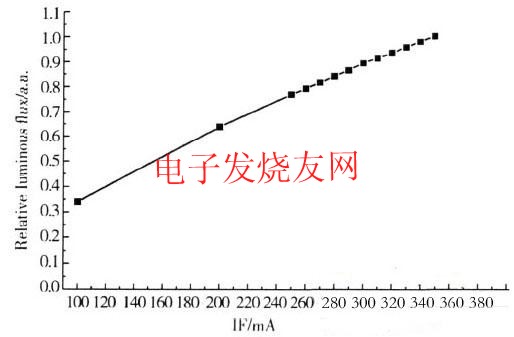 當電流增加時,注入發(fā)光區(qū)的電子發(fā)生非輻射復(fù)合的幾率變大,使器件的內(nèi)量子效率降低,同時,由于電流增加導(dǎo)致器件的溫度升高,使熒光粉的量子效率降低并進一步增加了非輻射復(fù)合的幾率。在圖5中,由于驅(qū)動電流在正常的工作電流內(nèi),器件的發(fā)光效率雖有一定的降低,但變化的幅度并不大。